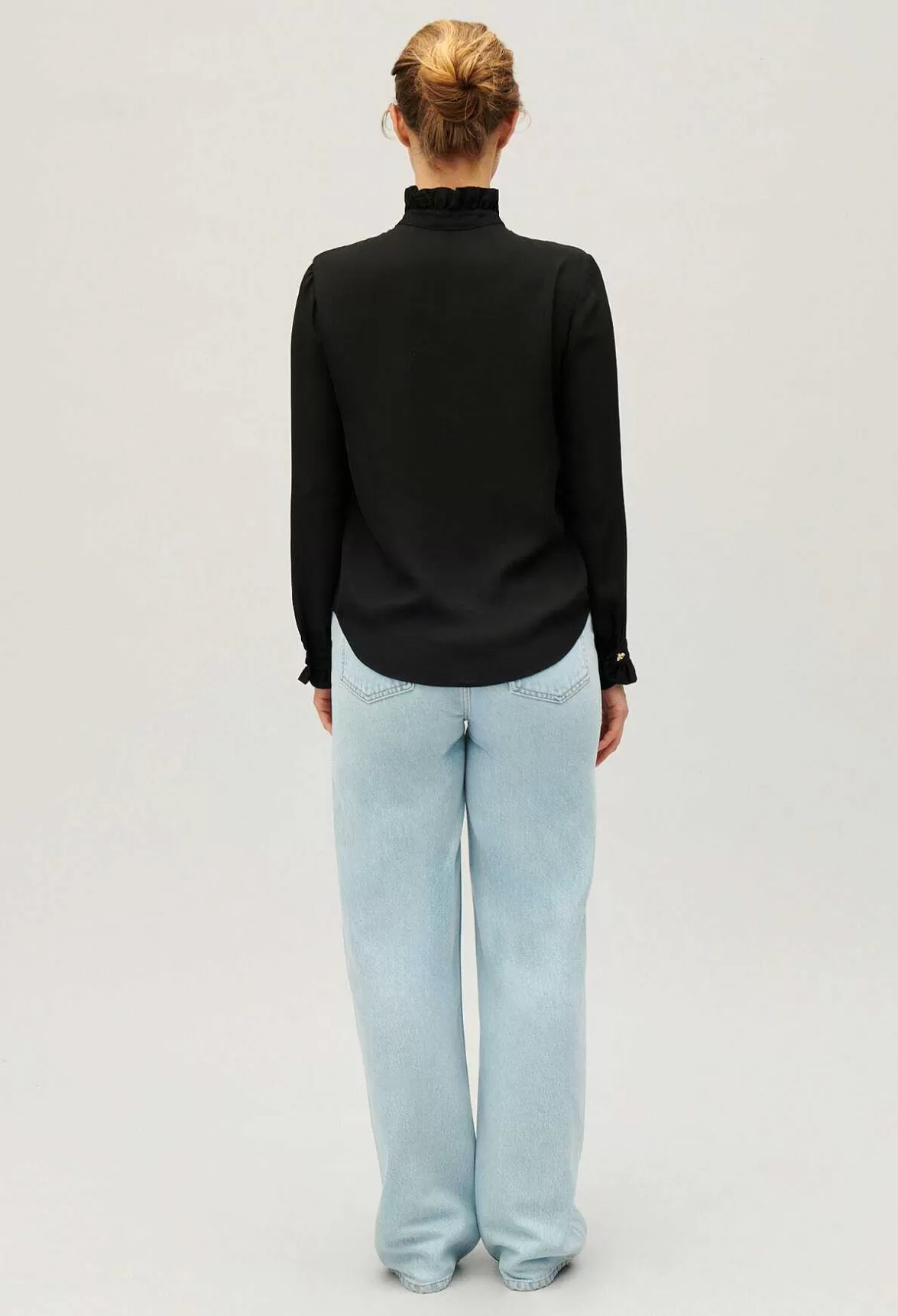 Straight Cut Long-Sleeved ShirtFlowing Black Crepe FabricCollar And Cuffs Finished With Gathered RufflesDecorative Bee B…