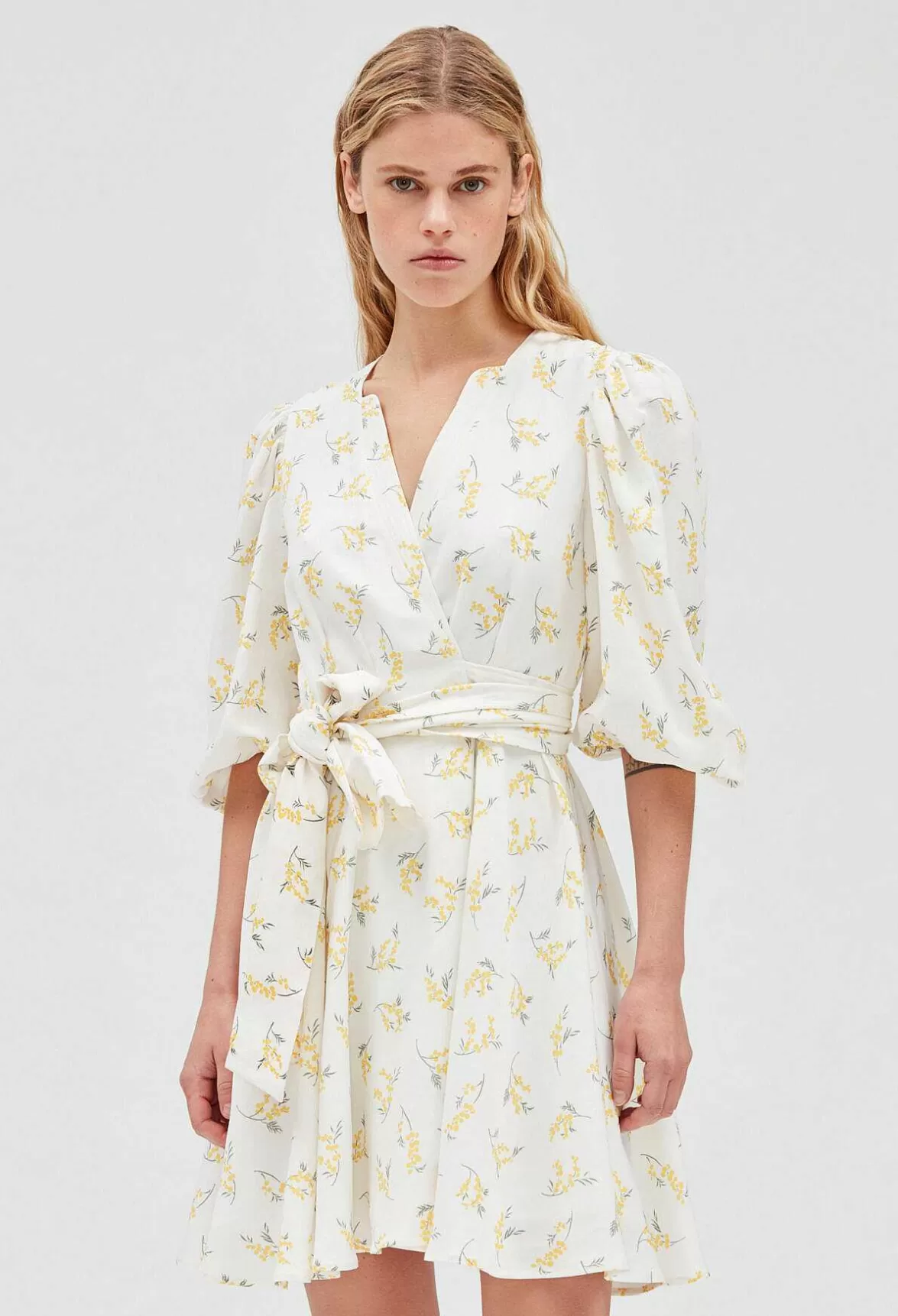 Short Wraparound DressMimosa PrintTie Belt At The Waist3/4 Puff Sleeves With Tightened HemFlared Skirt Model Is 172 Cm A…